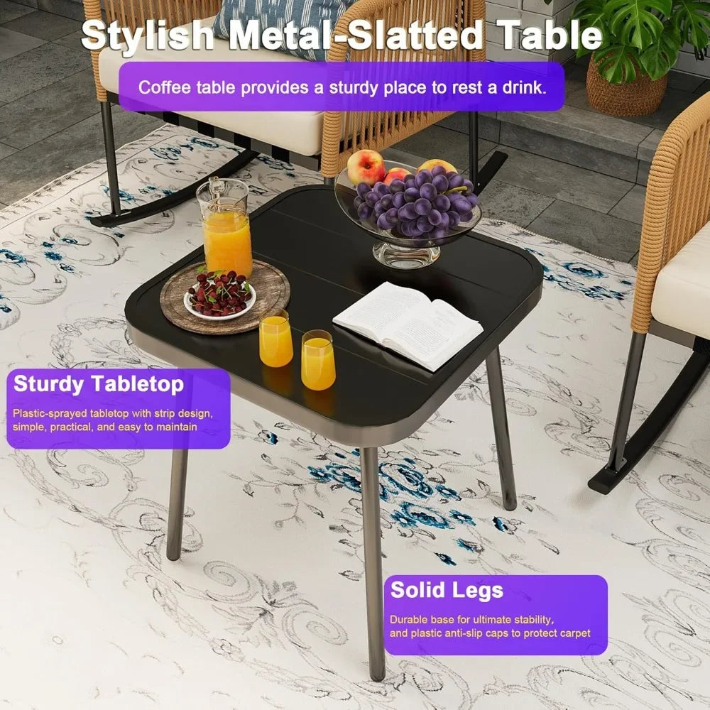 Two ergonomic rocking chairs pair with a coordinating coffee table to create a complete outdoor seating arrangement. The chairs feature a sturdy metal frame and contemporary rope seating for a comfortable, low-maintenance outdoor experience.