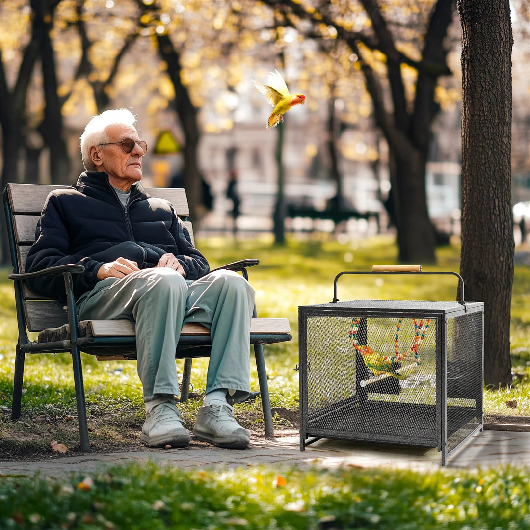 Take your feathered friend on the go with a portable bird cage that doubles as a travel carrier and a cozy playpen. Built from a sturdy iron frame with wood accents and stainless steel details, it provides a safe, roomy environment for birds during transport or at home.